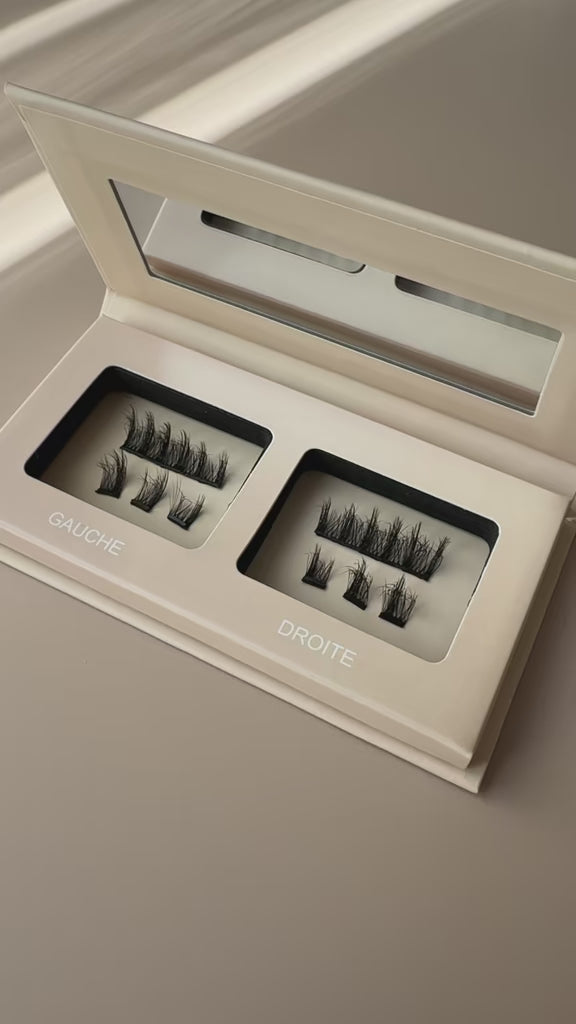 Chaque cil possède de petits aimants invisibles qui s’accrochent l’un à l’autre autour de vos cils naturels. Il suffit de placer une bande au-dessus et une au-dessous de vos cils : clic, ils se fixent instantanément sans colle ni produit.